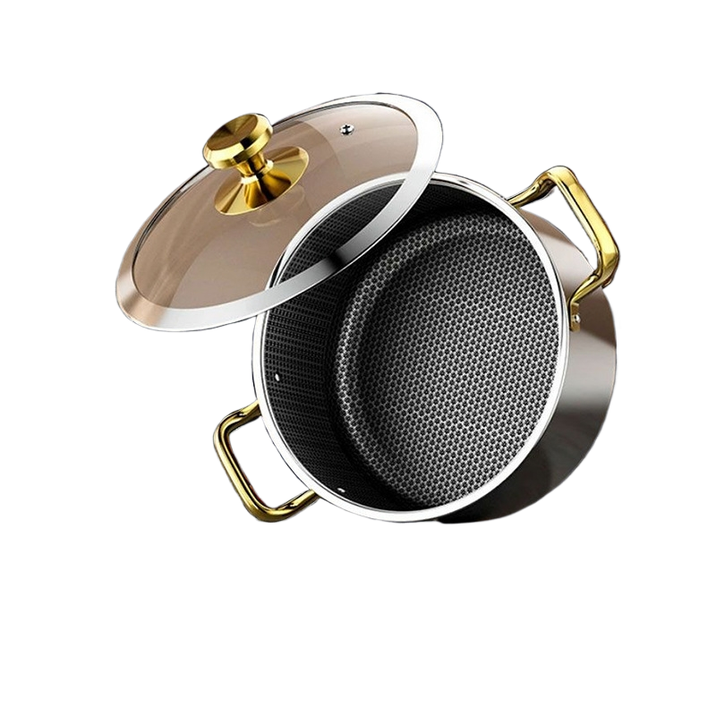 This stainless steel soup pot is designed for everyday cooking with a focus on practicality and durability. The honeycomb-patterned interior helps distribute heat evenly while making food release and cleaning easier during regular use.