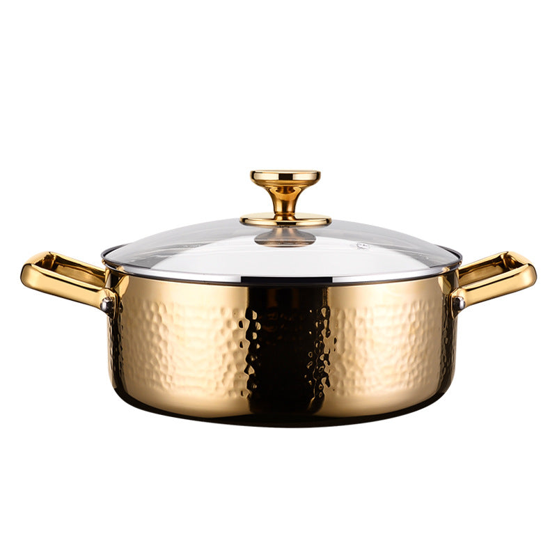The hammered finish gives the pot a distinctive, refined look while eliminating the need for interior rivets, resulting in a smooth and easy-to-clean cooking surface. Designed for flexibility, it works well for hot pot meals, noodles, and a wide range of household cooking tasks. A clear glass lid allows you to monitor cooking progress without lifting the cover.